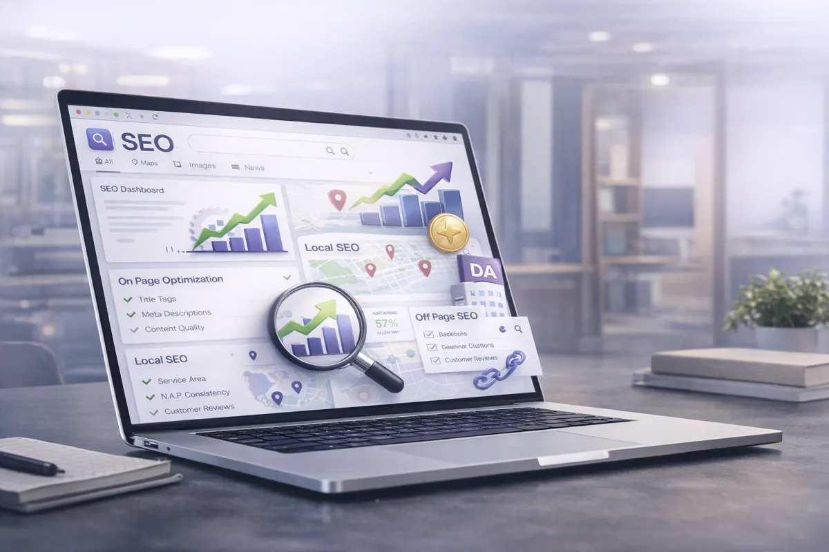 On page SEO focuses on optimizing your website structure, content, and technical elements. Off page SEO focuses on building authority and trust through external signals like backlinks and citations.