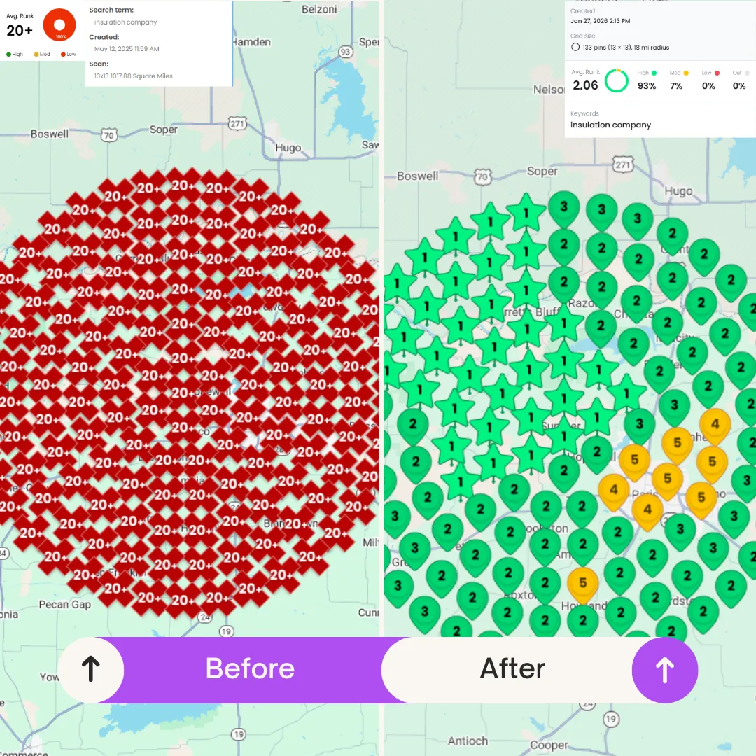 903 Spray Foam partnered with WebLead Systems to implement a complete on page and off page SEO system focused on local dominance. Key service area keywords moved from positions 20+ into top 2 map pack and organic rankings, overtaking competitors that previously outranked them.