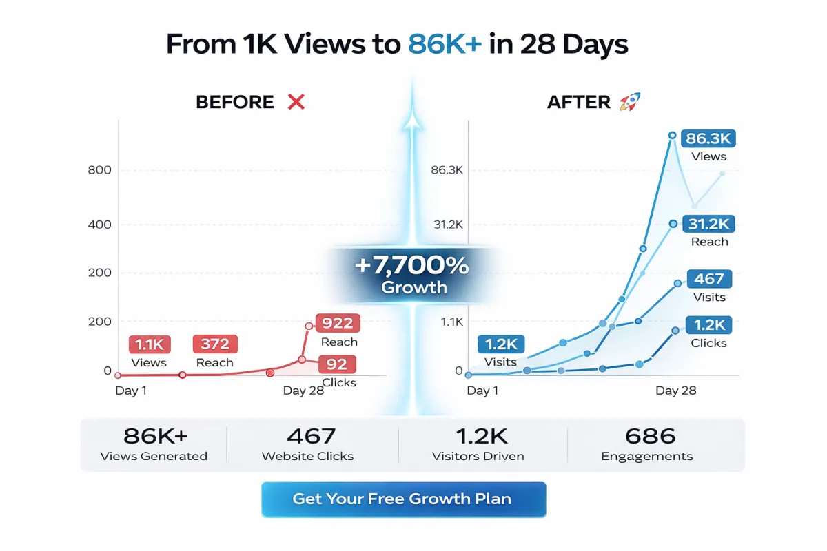 In just 28 days, results scaled dramatically. Views jumped from 1.1K to over 86K, website clicks reached 467, and traffic grew to 1.2K visits. What was once inconsistent is now a reliable system generating visibility, traffic, and real leads.